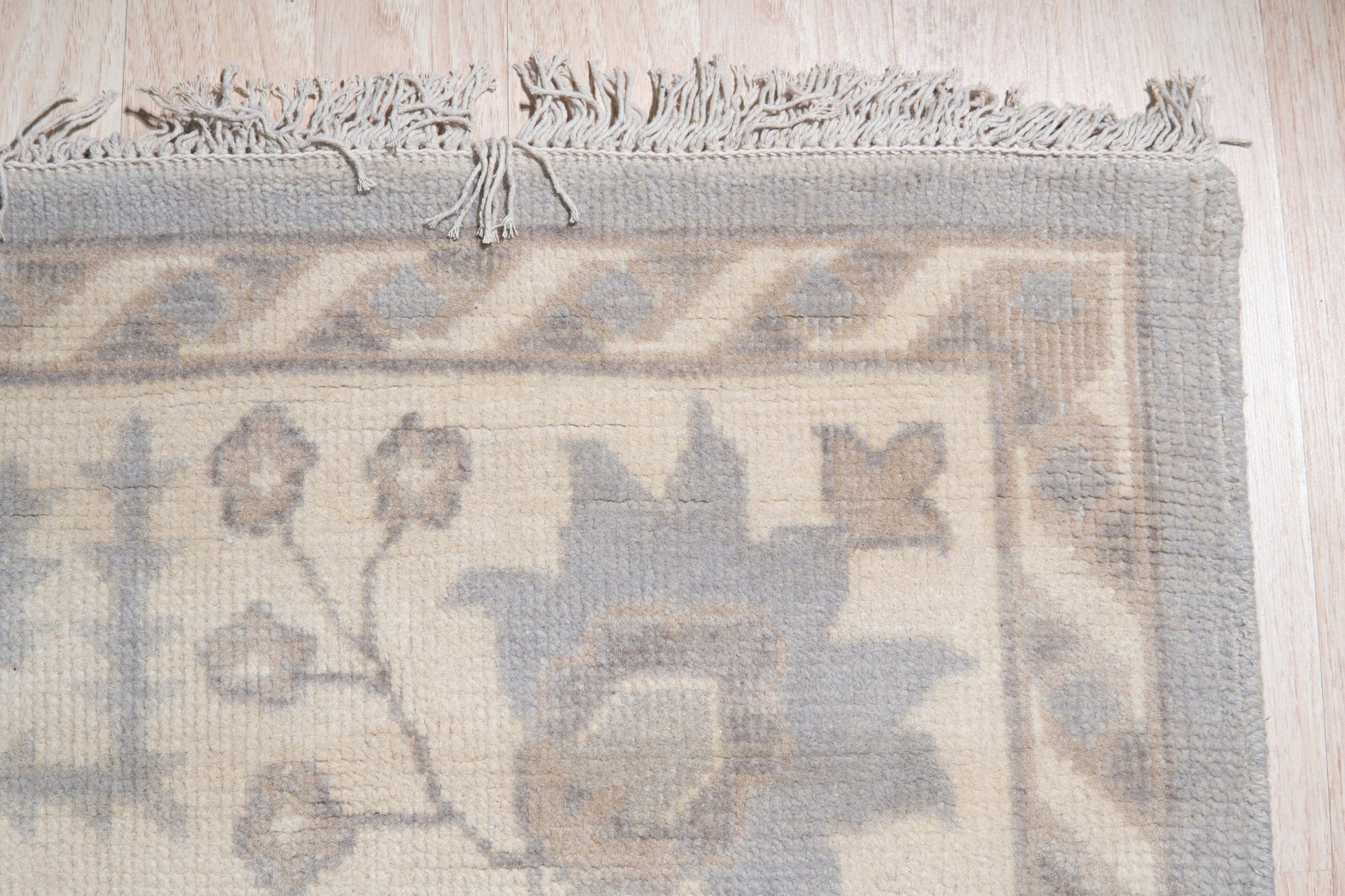 Imagine stepping into a room transformed by the serene elegance of this rug. A tranquil, muted blue field serves as the backdrop for an enchanting dance of stylized blossoms. Delicate shades of white, beige, and light gray intertwine to create a mesmerizing, repeating pattern. The central design is gracefully embraced by an elaborate, multi-layered border, where geometric precision meets floral artistry. A crisp, white fringe completes the piece, adding a touch of timeless sophistication and lending an air of refined heritage to any space.