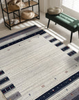Anchor your space with a foundation of understated elegance. A serene, off-white canvas is subtly striated with whisper-soft horizontal lines of gray, creating a calming visual texture. The rug's perimeter is defined by a striking, multi-layered border. Bands of deep navy, punctuated by crimson and muted gray, frame the central field. Within these borders, a tapestry of geometric motifs unfolds, featuring stylized trees, diamonds, and arrowheads, offering a modern interpretation of time-honored designs.